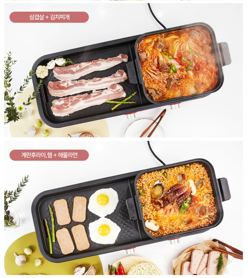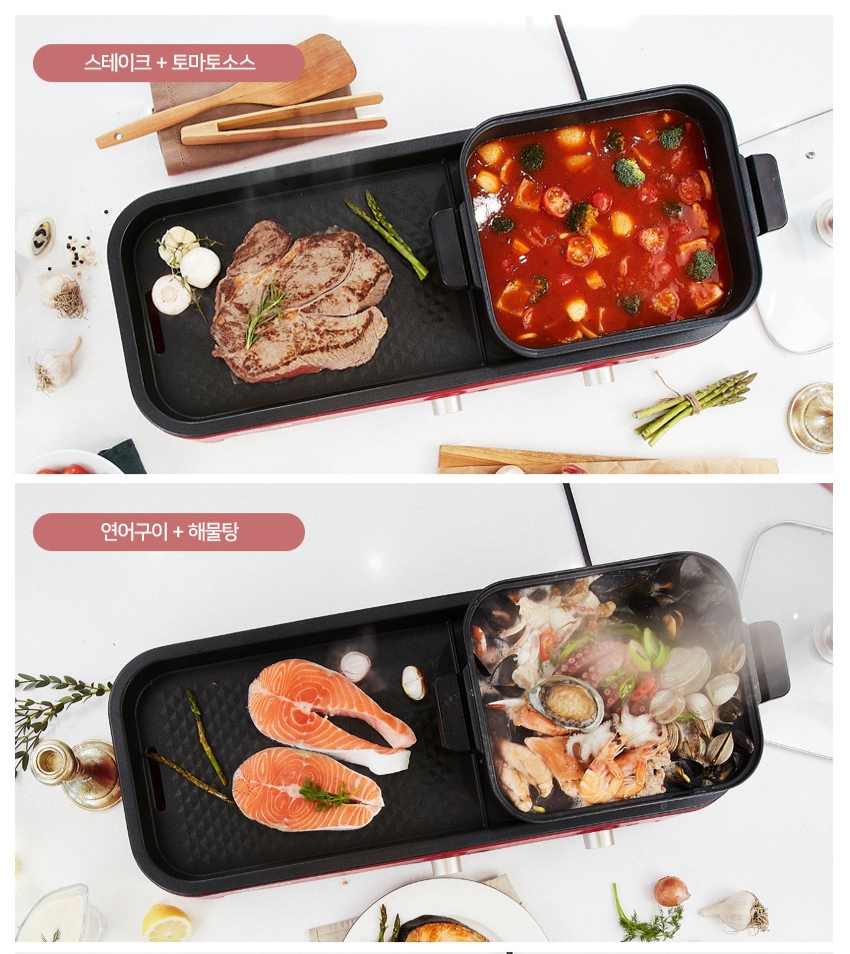 ✔ Bếp này hay ở chỗ là có thể ăn lẩu, nướng riêng hoặc vừa 1 bên nhúng lẩu, 1 bên lật thịt nướng cùng lúc nhờ 2 bếp chế độ độc lập.