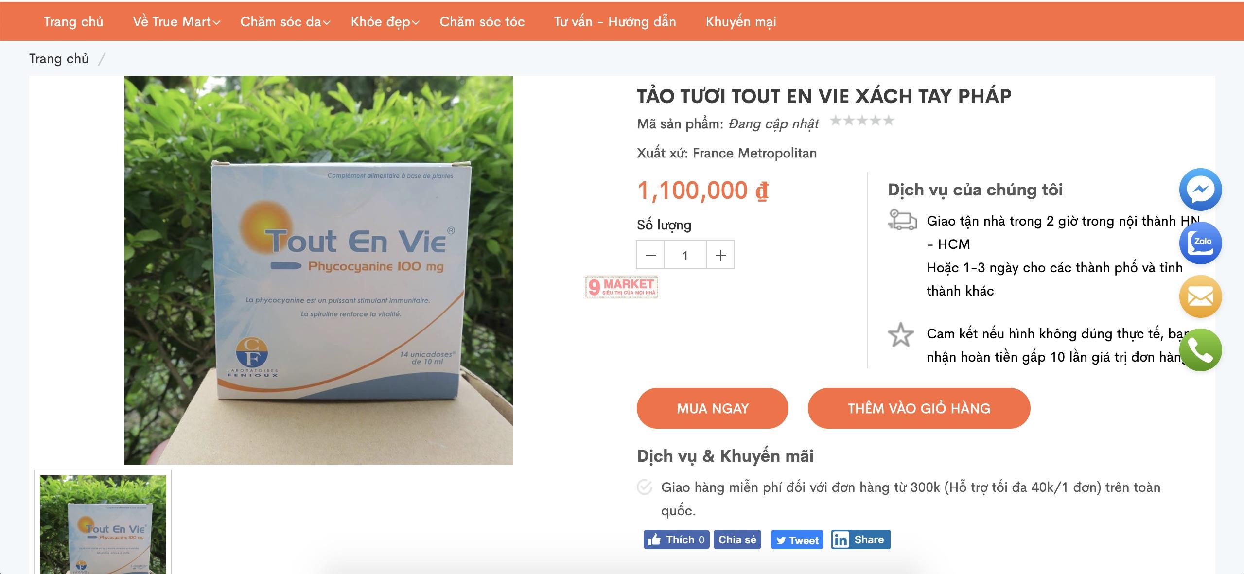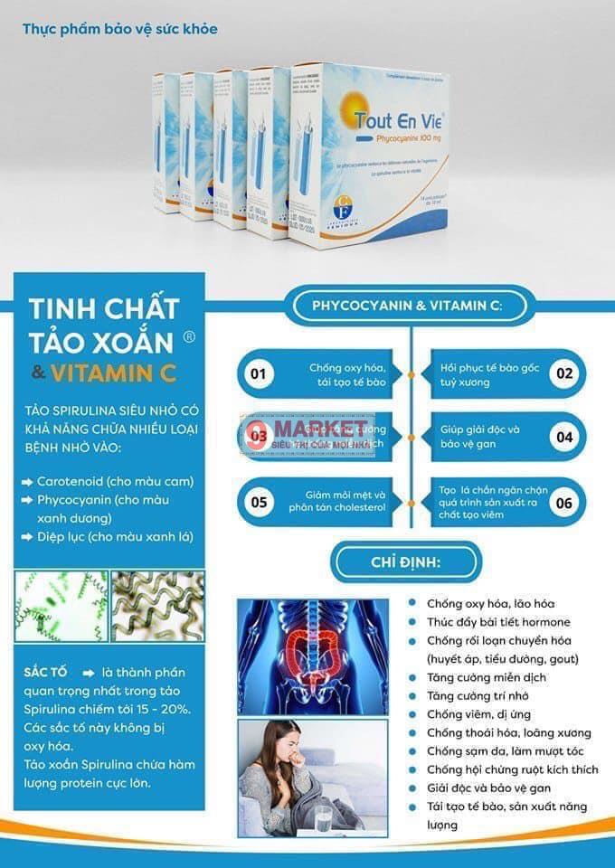 – Dung dịch tảo biển Vitamin C Tout En Vie 100mg với thành phần chính là tảo biển Spirulina - một loại tảo với kích cỡ cực nhỏ nhưng lại chứa hàm lượng cực lớn protein, oligo-elements, vitamin…,