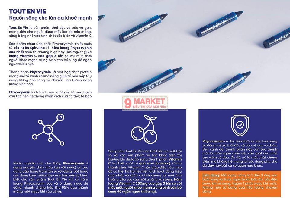 – Bên cạnh việc cung cấp chất dinh dưỡng cho các hoạt động sinh lý của cơ thể, thì với thành phần chứa nước, muối khoáng và nhiều chất dinh dưỡng, tảo biển được xem là một loại mỹ phẩm giúp chăm sóc da tuyệt vời, giúp tăng cường độ đàn hồi của làn da, mang lại làn da khỏe mạnh, căng sáng. Đặc biệt, với việc chế biến dạng nước, Tảo biển vitamin C Tout En Vie giúp cơ thể hấp thu tối đa dưỡng chất từ ống tảo so với dạng viên nén, viên con nhộng thông thường. Ống tảo có màu xanh đậm đặc do chứa hoàn toàn tinh chất tảo, không lẫn các loại hóa chất khác, không gây kích ứng cho người dùng