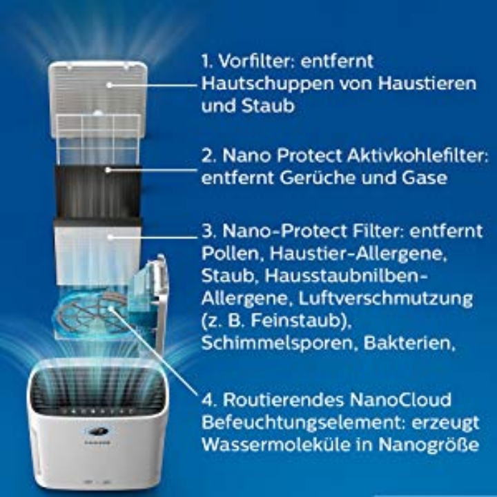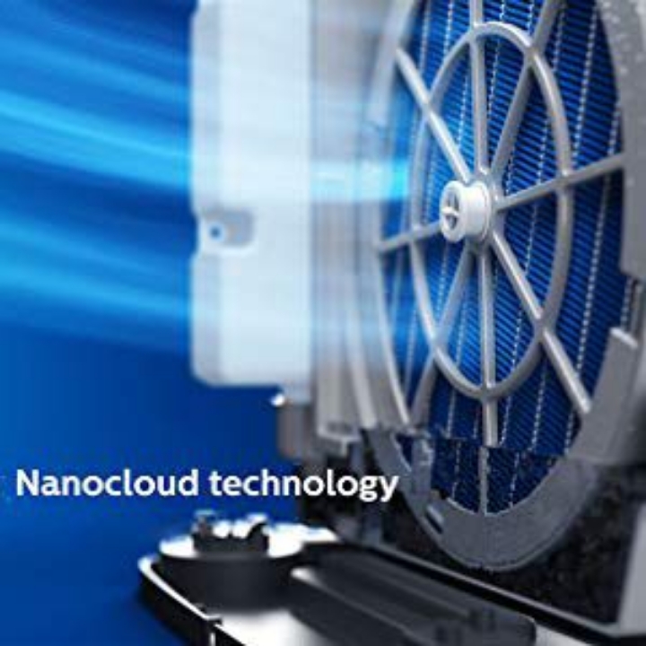Công nghệ NanoCloud sử dụng quy trình bay hơi tự nhiên và hợp vệ sinh, đảm bảo tốc độ làm ẩm lên tới 500 ml/giờ. Ngay khi nước bay hơi, những giọt nước trở nên vô hình và các phân tử nhỏ hơn gặp khó khăn khi chuyển vi khuẩn vào không khí. Các thử nghiệm trong phòng thí nghiệm của chúng tôi xác nhận rằng công nghệ NanoCloud lan truyền vi khuẩn ít hơn 99% so với trường hợp sử dụng máy tạo độ ẩm hàng đầu với công nghệ sóng âm thanh. Nó cũng ngăn ngừa các đốm ướt và bụi trắng.