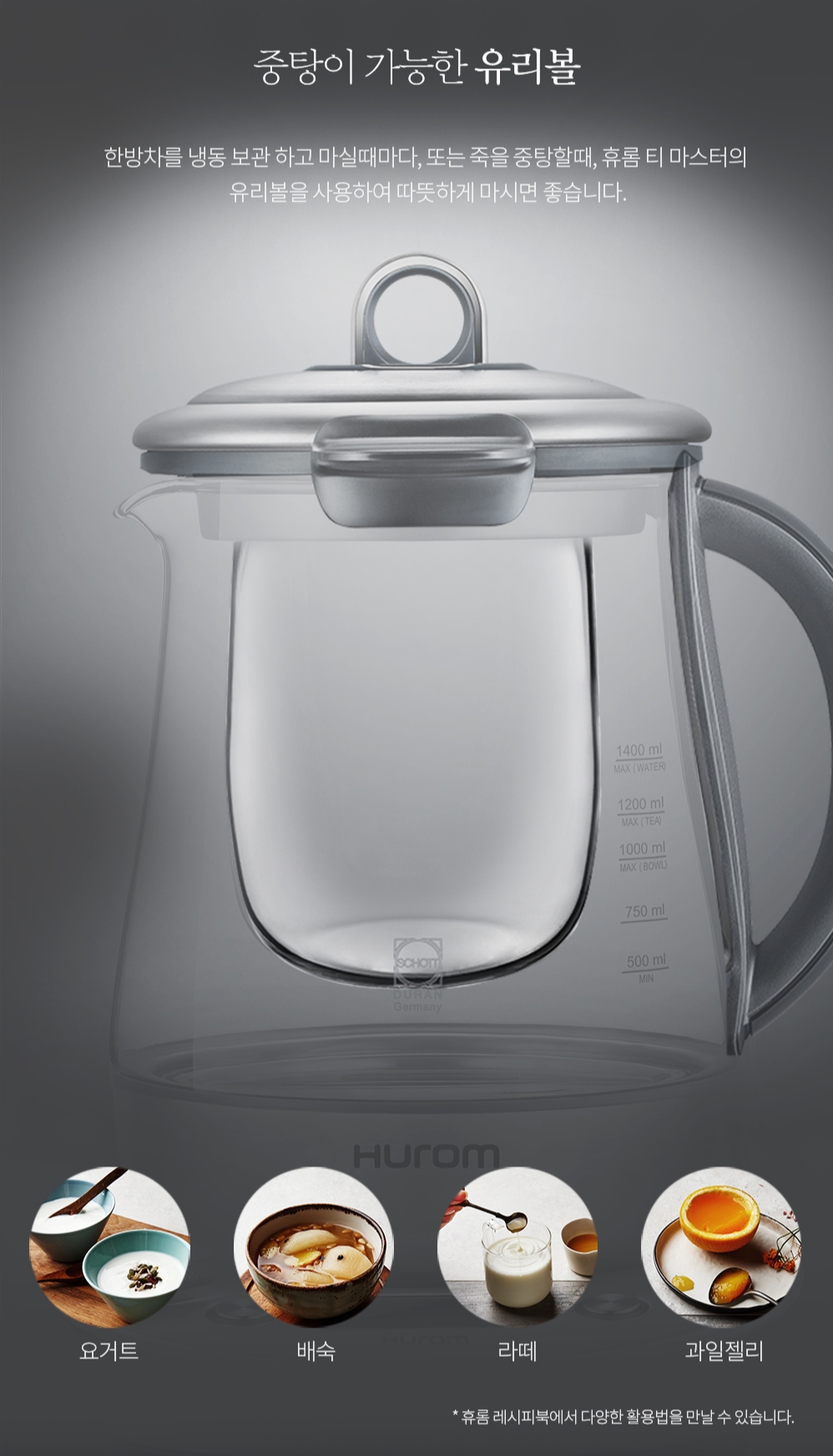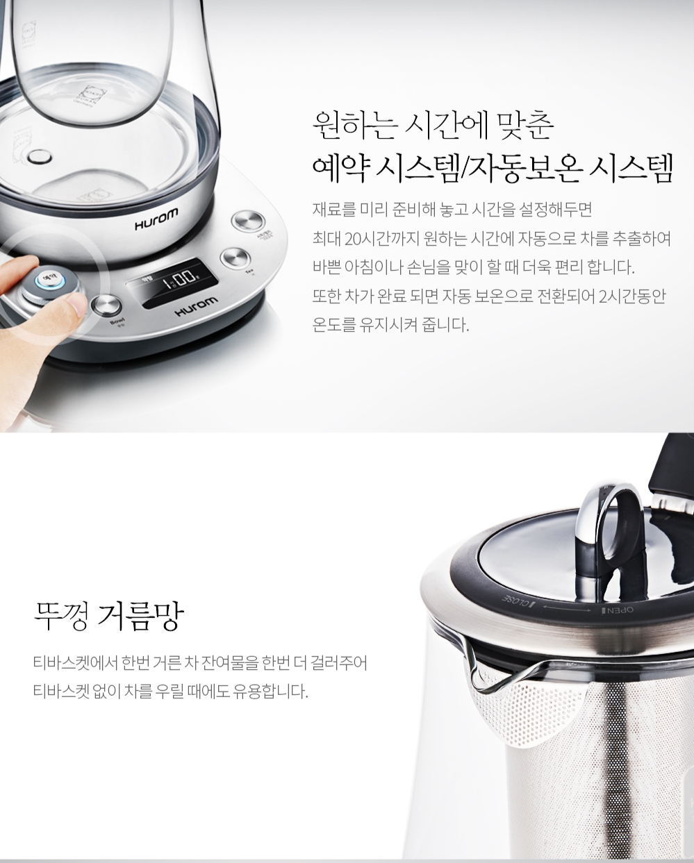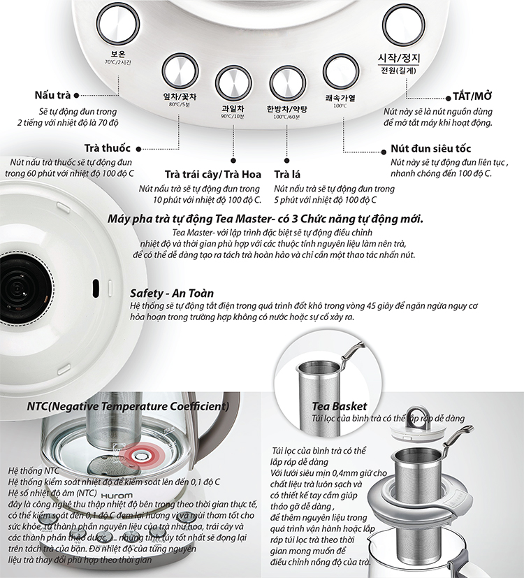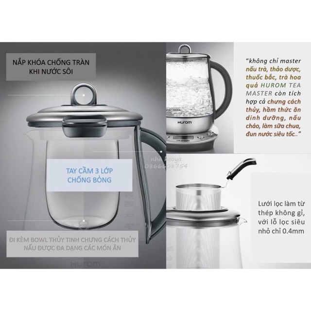 Hurom Tea Master là máy đa chức năng vừa là ấm đun nước siêu tốc, vừa là máy nấy các loại trà, nấm linh chi, sâm, thảo dược, vừa lại là máy chưng yên, nấm cháo, hầm các loại thức ăn giàu dinh dưỡng như bào ngư. Lại còn có thể làm các món tráng miệng như sữa chua. Đặc biệt có thể cùng 1 lúc nấu được 2 món khi dùng bolw thủy tinh