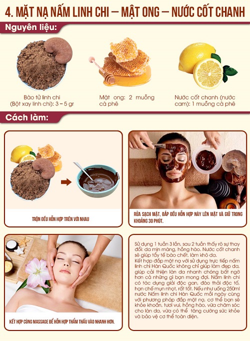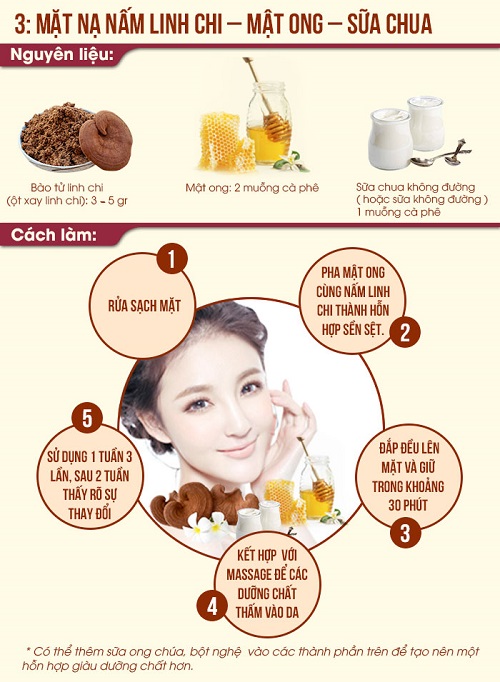 + Rửa sạch mặt, pha mật ong cùng nấm linh chi thành hỗn hợp sền sệt.
