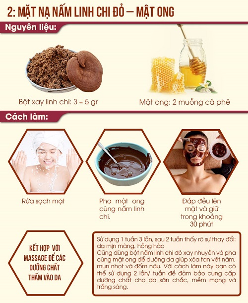 Cũng dùng bột nấm linh chi đỏ xay nhuyễn và pha cùng mật ong để dưỡng da giúp xóa tan vết nám, mụn nhọt và đốm nâu. Với cách làm này bạn có thể sử dụng 2 lần/ tuần để đảm bảo cung cấp dưỡng chất cho da săn chắc, mềm mọng và trắng sáng.