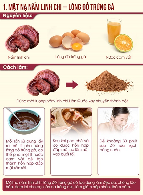 Đắp mặt nạ bằng nấm linh chi lòng đỏ trứng gà có tác dụng làm đẹp da, chống lão hóa, đem lại cho bạn làn da trắng mịn, làm giảm nếp nhăn, thâm nám.