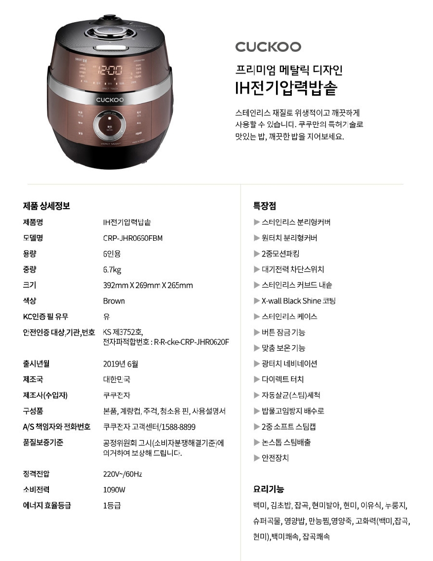 - Cuckoo CRP-JHR0660FBM bao gồm 22 tính năng an toàn đã được kiểm chứng và cấp phép.