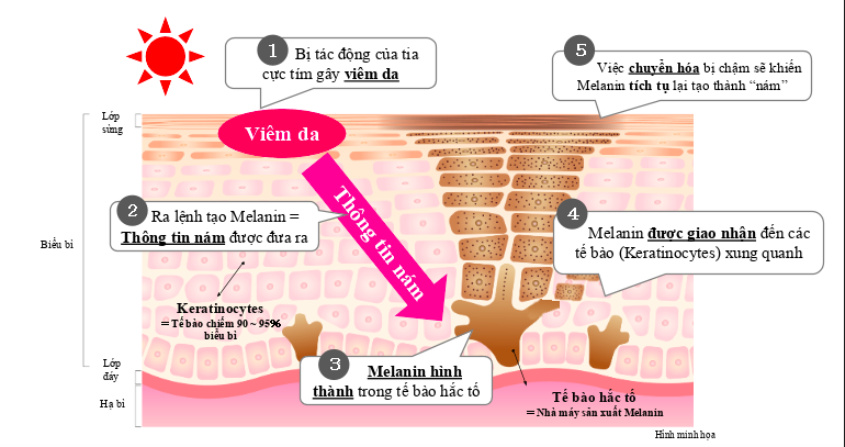 Nguyên nhân của sạm nắng là do tia UV. Khi da phải tiếp xúc tia UV quá nhiều sẽ sản sinh melanin, đẩy ra bề mặt da để bảo vệ da. Melanin thật ra là tốt cho cơ thể nhưng nó khiến da trở nên sạm đi, mất thẩm mỹ.