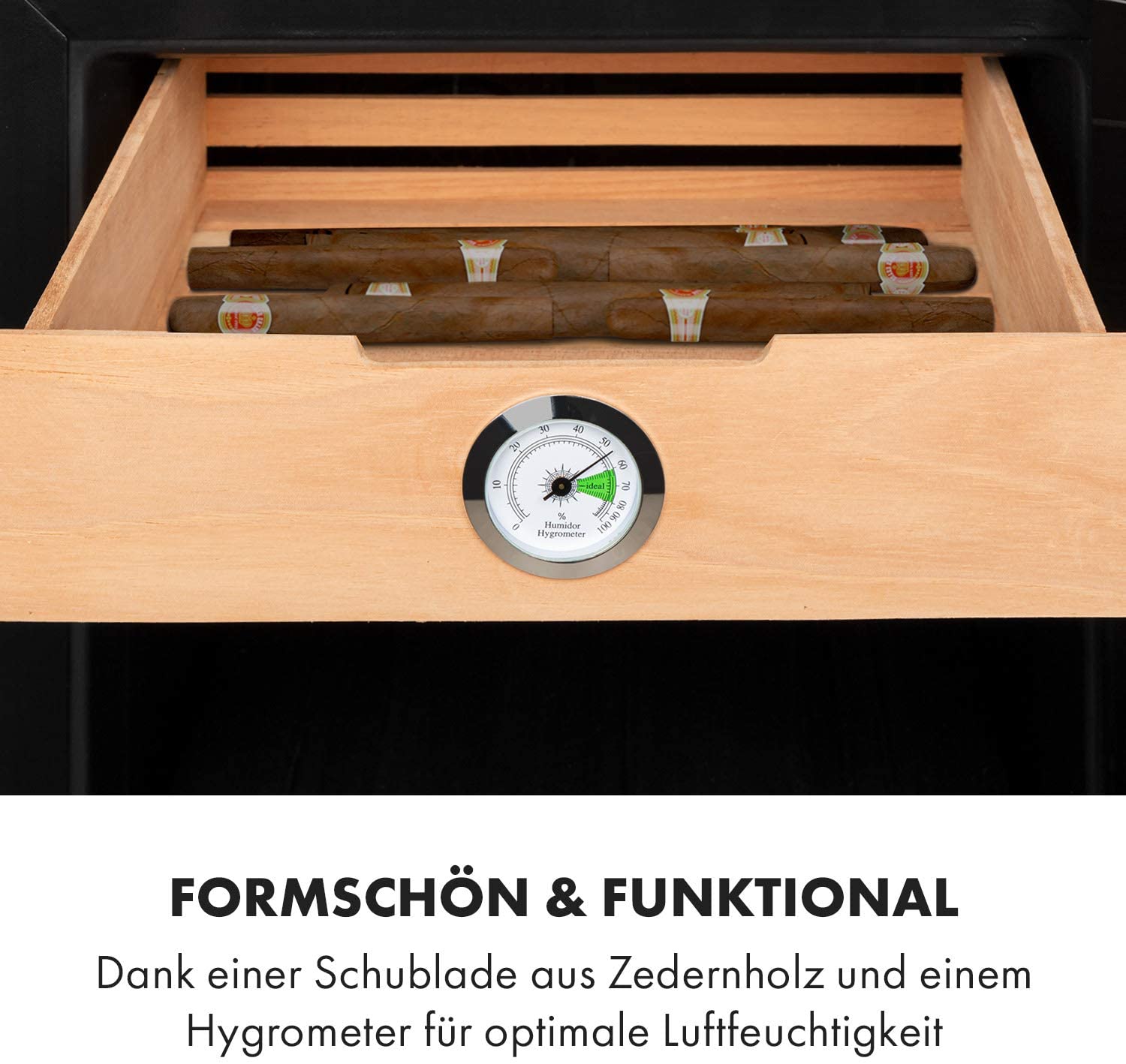 📍 Thanh lịch & tiện dụng: nhờ ngăn kéo gỗ tuyết tùng và ẩm kế cho độ ẩm không khí tối ưu